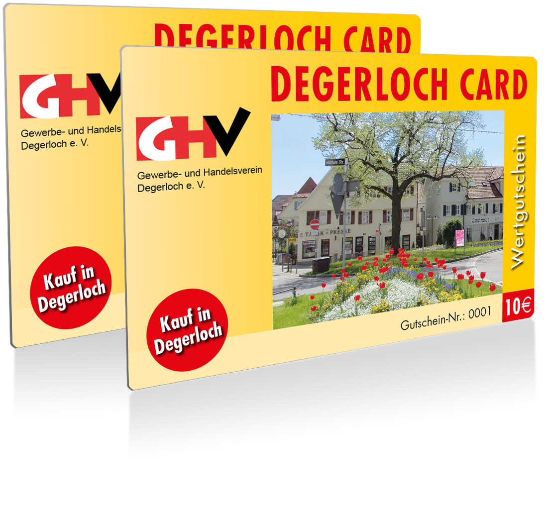 Die DEGERLOCH CARD wird bei vielen GHV-Mitgliedern aus Einzelhandel, Gastronomie, Handwerk und Dienstleistern als dem Bargeld gleichwertige Gegenleistung für den Einkauf von Produkten und Leistungen angenommen. Eine Bareinlösung oder Teileinlösung des Gutscheinwerts ist nicht möglich.