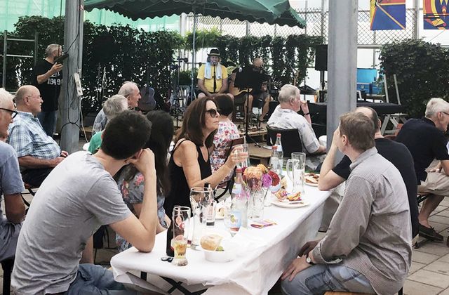 Ein Bier 1 Euro, ein Viertel Riesling 2 Euro und eine Rote vom Grill ebenfalls 2 Euro - gibt's eigentlich nicht! Gibt's sehr wohl, und zwar auf dem Sommerfest des International Choir of Stuttgart (ICS). Eingeladen war zu dem Anlass im Gewächshaus der Gärtnerei Tiedemann im Bruderrain auch der Chor des Stuttgarter Winzerbundes. Beide Chöre haben etwas gemeinsam, obwohl sie ansonsten grundverschieden sind: In beiden Formationen singt Gärtnermeister Heinz Tiedemann (Bild unten li.).