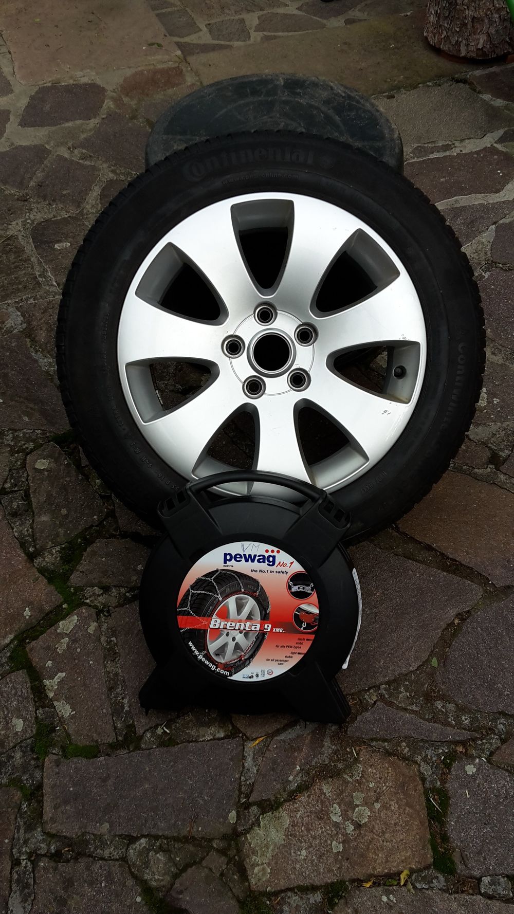 4 Alufelgen 205/55 R16 mit Conti-Winterreifen, dazu: Schneeketten. Auf Skoda Superb gefahren. Abholung Stuttgart