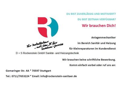Wir suchen: Anlagenmechaniker im Bereich Sanitär und Heizung für Kleinreparaturen im Kundendienst. Komm einfach vorbei oder ruf uns an: Gomaringer Straße 4A , 70597 Stuttgart.