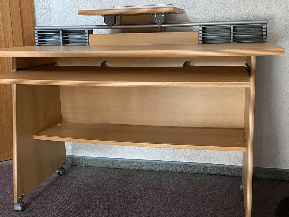 Verkaufe für 20 EUR einen sehr gut erhaltenen Computertisch, Buchenholz-Optik. (L 119 cm x B 64 cm x H 75 cm). Fahrbar, ausziehbare Ablage für Tastatur, verschiebbarer Schlitten (L 44 cm x B 34 cm) für den Bildschirm, Einsteckmöglichkeit für 20 CD's mit Hülle, Ablagefach unter der Tastaturablage. Sehr gut erhalten, keine Beschädigungen, gegen Abholung.