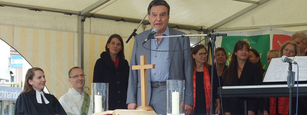 Der Mann hat das "Degerlocher Markplatzfest" erfunden, das alle zwei Jahre mit einer Portion Alpenrock der Trenkwalder vor dem Bezirksrathaus über die Bühne geht. Ein Ökumenischer Gottesdienst gehört regelmäßig zum Programm, der von Rolf Reihle (Bild, vorne) und seinem Freundeskreis Wildermieming organisierten Veranstaltung. Wenn der Fest-Chef dann auf der Bühne hinter dem Kreuz des provisorischen Altars steht, um über den weiteren Verlauf zu informieren, macht er einen richtig guten Eindruck. Eigentlich hätte er auch die Predigt halten können - wenn er doch einst dem Rat seines Vaters gefolgt wäre.