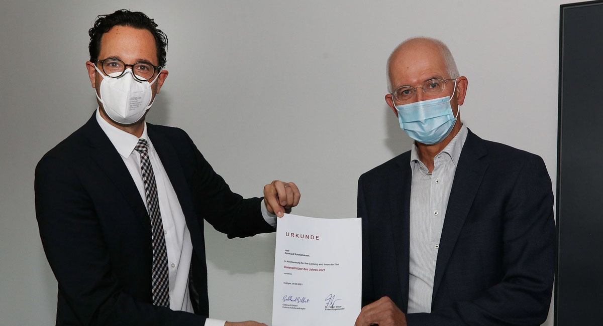Dem Degerlocher, verantwortlich bei der Stadt für Organisation, Personalentwicklung und Digitalisierungsprojekte, ist kürzlich der Preis "Datenschützer des Jahres 2021" verliehen worden. Als Anerkennung für seine Leistung, die Prozesse der Arbeitszeiterfassung zu digitalisieren, hat ihm der Erste Bürgermeister Fabian Mayer (Bild li.) die Auszeichnung überreicht und betonte dabei: "Prozesse zu digitalisieren, ist eine komplexe Aufgabe. Herr Schmidhäuser hat mit seiner Arbeit nicht nur Arbeitsabläufe beschleunigt und vereinfacht, sondern auch den Datenschutz verbessert und gleichzeitig noch der Umwelt etwas Gutes getan."