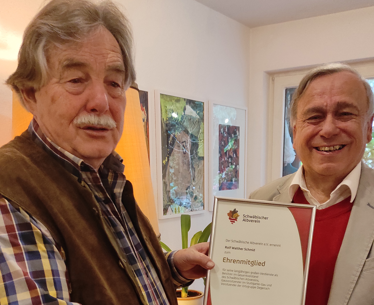 Die hohe Auszeichnung war für die Jahreshauptversammlung vorgesehen, die Rolf Walther Schmid leider nicht mehr erleben durfte. Der Präsident des Schwäbischen Albvereins, Hans Ulrich Rauchfuß (Bild re.), überbrachte bei einem persönlichen Besuch in Degerloch bei Dieter O. Schmid, dem Bruder des Geehrten, die Ernennungsurkunde samt Ehrenzeichen.