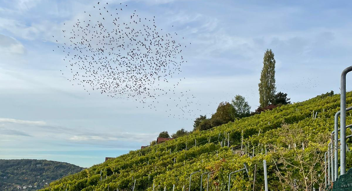 Und um es vorwegzunehmen, die Gäste brauchen nicht zu fragen, ob der Wein ausreicht. Trotz Frost, Hagel und zuletzt einem Angriff der Stare (Bild) reicht der Vorrat aus, um alle Gäste zu versorgen. "Es gibt genügend Wein, wir hatten ja letztes Jahr nur zwei Wochen geöffnet", sagt Eberhard Gohl, der die Weinlese mit seinem Team dieses Jahr etwas vorgezogen hat.