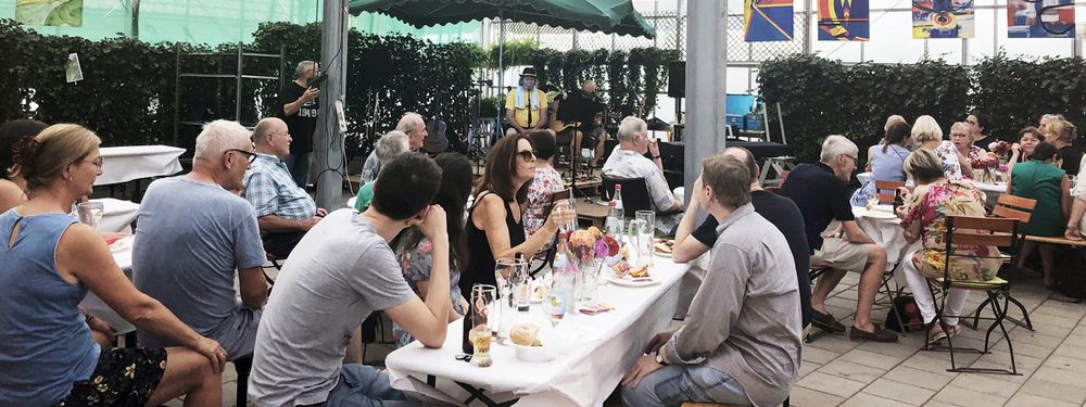 Ein Bier 1 Euro, ein Viertel Riesling 2 Euro und eine Rote vom Grill ebenfalls 2 Euro - gibt's eigentlich nicht! Gibt's sehr wohl, und zwar auf dem Sommerfest des International Choir of Stuttgart (ICS). Eingeladen war zu dem Anlass im Gewächshaus der Gärtnerei Tiedemann im Bruderrain auch der Chor des Stuttgarter Winzerbundes. Beide Chöre haben etwas gemeinsam, obwohl sie ansonsten grundverschieden sind: In beiden Formationen singt Gärtnermeister Heinz Tiedemann (Bild unten li.).
