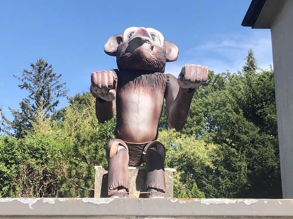 Über ein Jahrzehnt saß er still und traurig mit gesenktem Kopf in einer Büroecke seines Herrchens Rolf Reihle. Die lange Zeit hat ihm farblich etwas zugesetzt, dafür darf er jetzt frische Gartenluft an der Jahnstraße genießen. Sein trauriger Anblick mit gesenktem Kopf ist Vergangenheit. Degerlochs einziger Affe aus einer spektakulär gescheiterten Aktion sitzt auf Reihles Garagendach und blickt zufrieden gen Himmel. Wohl dem, der einen Affen hat.