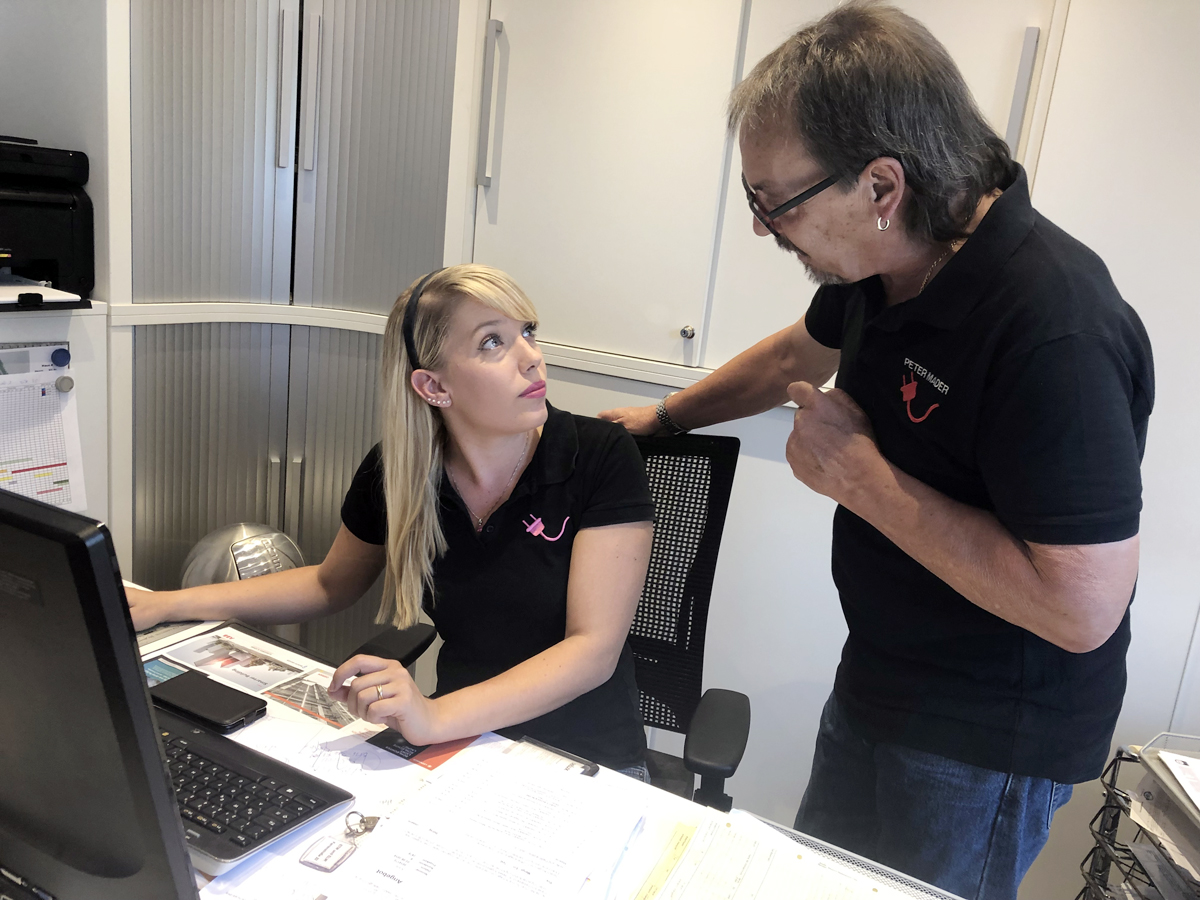 Dass seine Tochter während ihrer Tätigkeit am Flughafen Außergewöhnliches auf sich nahm, um die Meisterprüfung zu absolvieren, spricht für Zielstrebigkeit und Belastbarkeit. Beides gute Voraussetzungen für die zukünftige Geschäftsführung von Mader Elektroinstallationen. „Ich musste dafür auf sehr viel Freizeit und Urlaub verzichten und einen fünfstelligen Betrag investieren, blicke aber trotzdem noch mit etwas Wehmut auf meinen Job am Flughafen zurück“, sagt die neue Chefin im Handwerksbetrieb Mader, die sich jetzt um Kundenbetreuung, Personal, Buchhaltung und handwerkliche Arbeiten kümmern muss, statt Fluggästen die Taschen zu durchstöbern. Dass sie diese Position im Betrieb ihres Vaters eingenommen hat und nicht einer ihrer Brüder, die Elektroingenieur, Koch und Bierbrauer geworden sind – das ist das Besondere an der Degerlocher Familie.