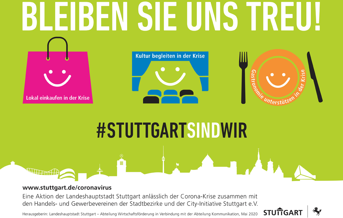 "Durch den Lockdown wird uns erst bewusst, wie sehr wir das unbeschwerte Bummeln in den Geschäften unserer Stadt vermissen, wie viel uns der sonst übliche Theater- oder Konzertbesuch bedeutet, wie wichtig uns das Stammlokal um die Ecke ist", sagt Ines Aufrecht, Leiterin der Wirtschaftsförderung Stuttgart. "Bleiben Sie uns treu!" - Mit dieser prägnanten und zugleich emotionalen Botschaft der Stadt sollen möglichst viele Menschen erreicht und zur Mithilfe und Solidarität aufgerufen werden. Die Möglichkeiten sind vielfältig: lokal einkaufen vor Ort, die geöffneten Gastronomiebetriebe nutzen oder Kultureinrichtungen mit Gutscheinen und Abos unterstützen.