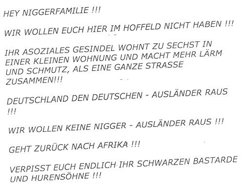 Degerloch ein Ort der Ruhe und Beschaulichkeit? Im Allgemeinen schon, aber auch hier gibt es immer wieder Ausnahmen. Heftige Ausnahmen. Das musste die Familie Williams aus dem Hoffeld kürzlich zur Kenntnis nehmen. In ihrem Briefkasten in den Zaunwiesen landete ein Schreiben, dessen Inhalt man eigentlich nur mit „widerlich“ bezeichnen kann.