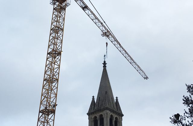 Ein zweiter Kran fuhr nun heran / oben drauf mit einem Mann, / der beherzt den Hahn befreite, / der Baukran schwenkte schnell zur