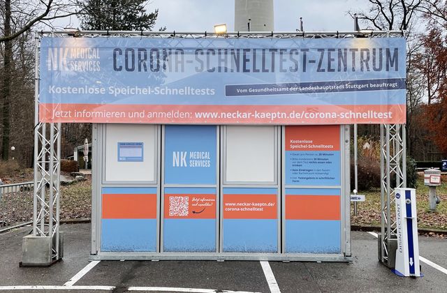 Fernsehturm |Wir schon im Frühsommer hat der Neckar Käpt'n jetzt auch auf dem Parkplatz am Fuße des Stuttgarter Wahrzeichens ein Testzentrum installiert. Die kostenlosen Speicheltests dauern pro Person 20 Minuten, eine halbe Stunde vor dem Test sollte nicht mehr gegessen und getrunken werden - ein