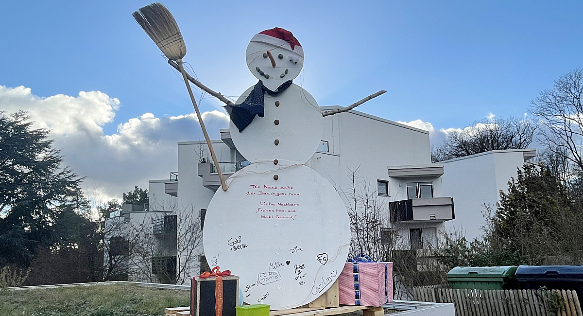 "Die Nase spitz, der Bauch ganz rund - liebe Nachbarn, frohes Fest und bleibt gesund", so lautet die Botschaft an dem Hoffeld-Schneemann in winterlichen Corona-Zeiten. "Wünschst du auch allen ein Weihnachtswunder? Dann schreibe deinen Namen drunter", stand letztes Jahr auf einem weihnachtsbaumähnlichen Gebilde. Viele haben unterschrieben und dieses Jahr war es nicht anders, obwohl die Aufforderung zur Unterschrift fehlte.