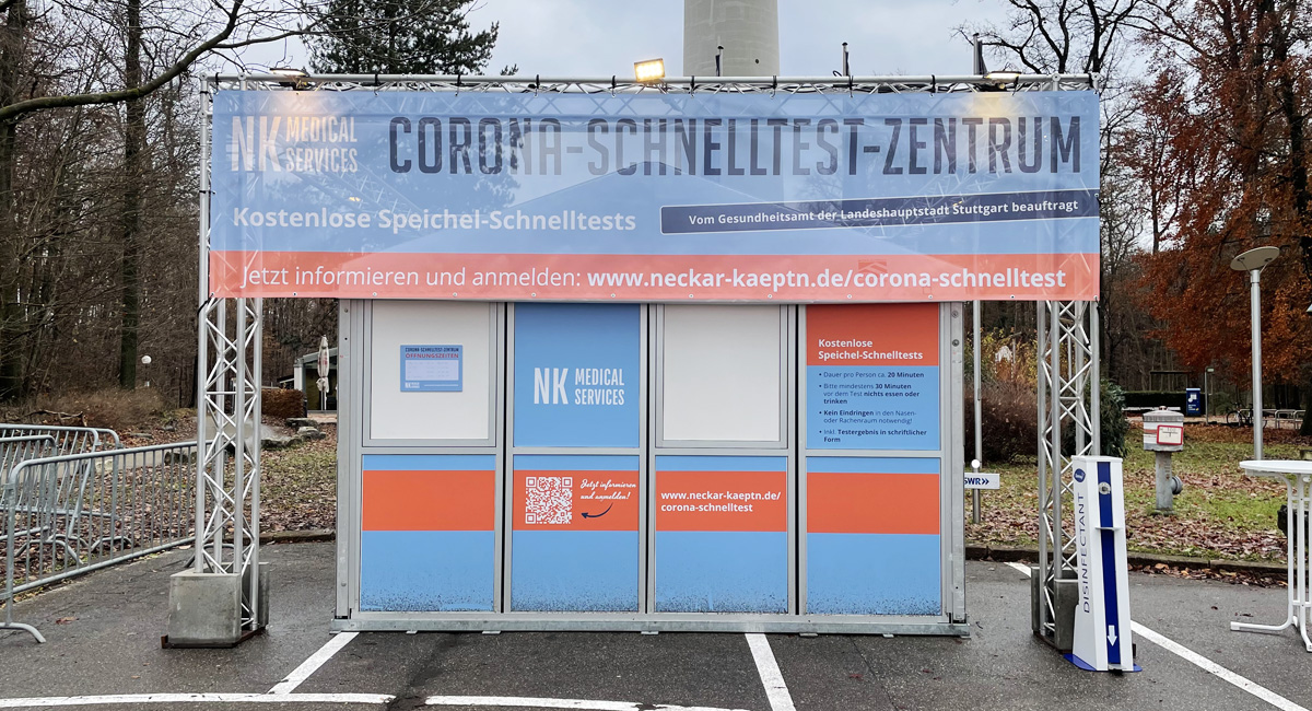 Wir schon im Frühsommer hat der Neckar Käpt'n jetzt auch auf dem Parkplatz am Fuße des Stuttgarter Wahrzeichens ein Testzentrum installiert. Die kostenlosen Speicheltests dauern pro Person 20 Minuten, eine halbe Stunde vor dem Test sollte nicht mehr gegessen und getrunken werden - ein Eindringen in den Nasen- und Rachenraum entfällt. Geöffnet ist von Montag bis Mittwoch von 8 bis 18 Uhr, Donnerstag und Freitag von 12 bis 21 Uhr, Samstag 10 bis 21 Uhr, Sonn- und Feiertag von 10 bis 18.30 Uhr.