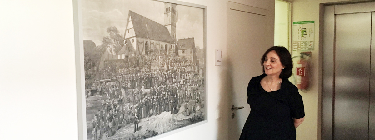 Nach der Sanierung des Bezirksrathauses fand das Herbstfestbild in den Degerlocher Amtsstuben leider keinen Platz mehr, was Gerhard Raff stets monierte. Der Historiker teilte Bezirksvorsteherin Brigitte Kunath-Scheffold (Bild) mit, dass er ihr Amtsgebäude nicht mehr betreten wird, bis das Bild wieder wie bisher gewürdigt wird. Daraufhin wurde im Ausstellungsbereich des Erdgeschosses für kurze Zeit ein Platz gefunden. Schwuppdiwupp war es allerdings wieder abgehängt, warum auch immer. Angeblich sei es zu schwer gewesen für die Wände des sanierten Hauses.
