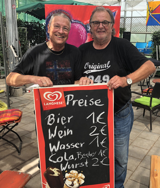 Ein Bier 1 Euro, ein Viertel Riesling 2 Euro und eine Rote vom Grill ebenfalls 2 Euro - gibt's eigentlich nicht! Gibt's sehr wohl, und zwar auf dem Sommerfest des International Choir of Stuttgart (ICS). Eingeladen war zu dem Anlass im Gewächshaus der Gärtnerei Tiedemann im Bruderrain auch der Chor des Stuttgarter Winzerbundes. Beide Chöre haben etwas gemeinsam, obwohl sie ansonsten grundverschieden sind: In beiden Formationen singt Gärtnermeister Heinz Tiedemann (Bild unten li.).