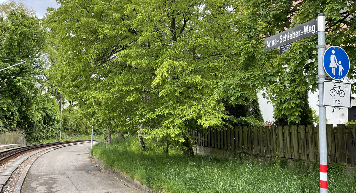 In unregelmäßigen Abständen beleuchten wir die Benennung Degerlocher Straßennamen - heute der Anna-Schieber-Weg, der 1977 nach der Schriftstellerin benannt wurde. Er führt von der Zacke-Haltestelle an der Melittastraße entlang der Schienen zur Kreuzung Jahn- und Karl-Pfaff-Straße.