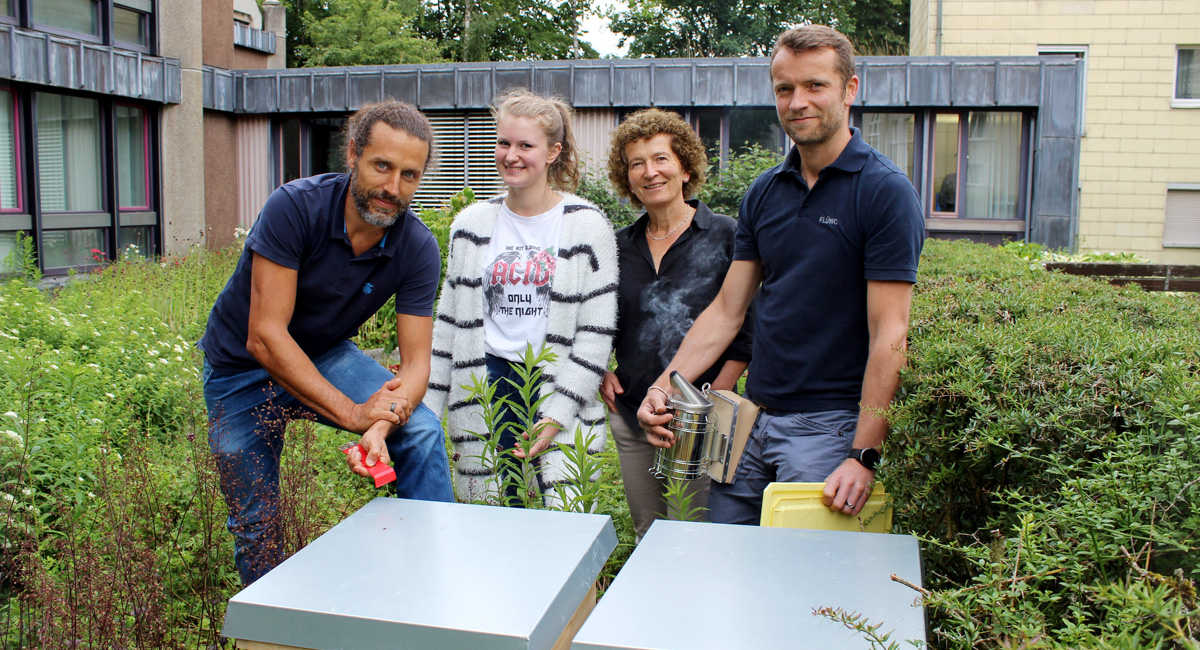 Im Sommer war es schließlich soweit: Zwei Bienenvölker haben auf dem Firmengelände der Wohnbaugenossenschaft Einzug gehalten. In Zusammenarbeit mit einem erfahrenen lokalen Imkermeister hatte die Flüwo-Projektgruppe zuvor das Beet nahe des Haupteinganges zum Verwaltungsgebäud als idealen Standort für die Bienenvölker als neue, besondere Nachbarschaft festgelegt. Eine Beobachtung ist für die Belegschaft und interessierte Gäste jederzeit möglich.